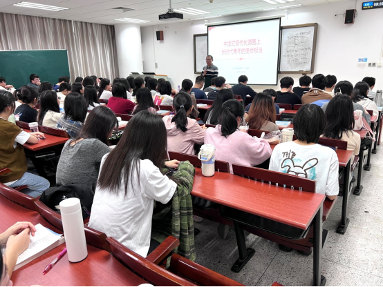 杜应发以“中国式现代化”为主题,以毛泽东、周恩来、邓小平等老一辈革命家青年时期的抱负追求为例,指出广大青年是推进中国式现代化的先锋力量。随后,杜应发与同学们共同学习了习近平总书记视察广东重要讲话精神,引导同学们牢记总书记对广东“在推进中国式现代化建设中走在前列”的嘱托,切实感悟宏伟蓝图已绘就,青春奋斗正当时,努力把个人发展融入民族复兴的伟业之中。