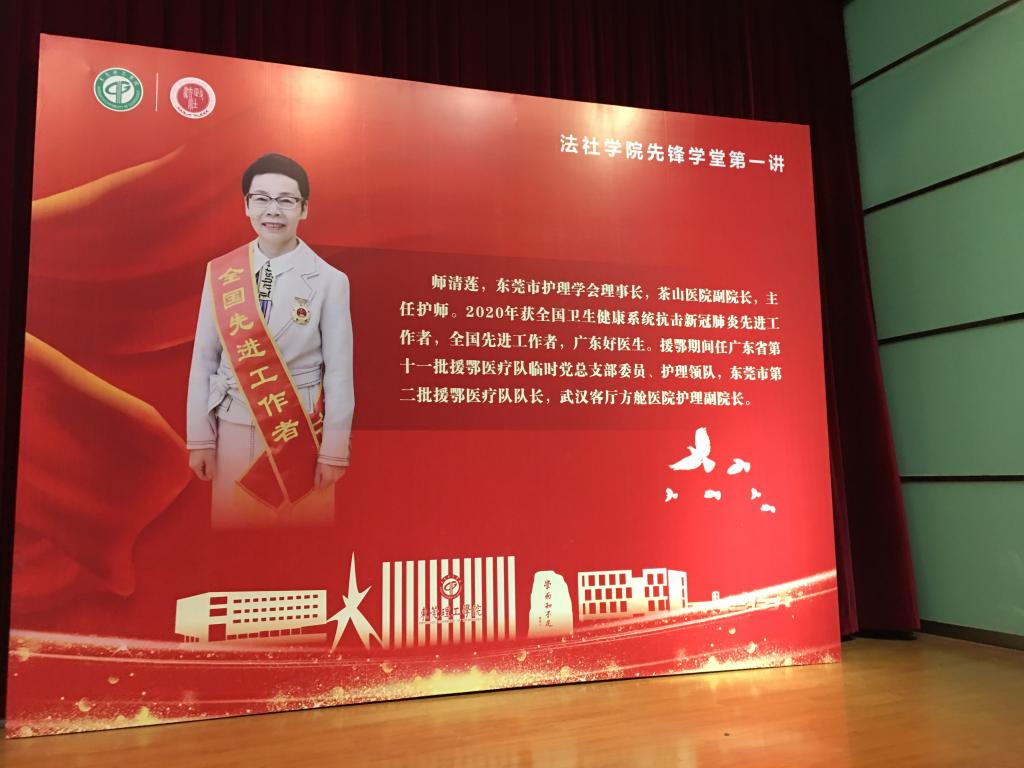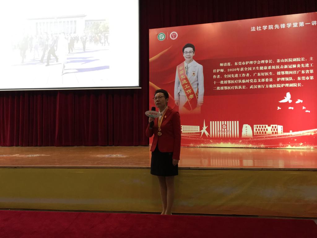 主办的“法社先锋学堂”第一期在莞城校区学术报告厅举行。本期主题为 “责任,使命,担当”,邀请到全国卫健系统抗击新冠肺炎先进工作者师清莲副院长主讲。莞城校区党工委书记、管委会常务副主任刘健,禁漫