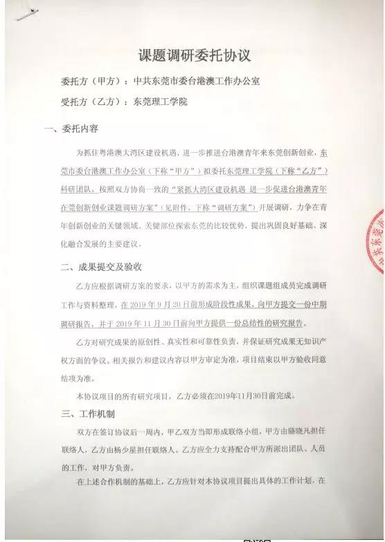 公共管理与社会工作教师党支部携手东莞市委台港澳办,建立业务合作意向,9月份签署了《紧抓大湾区建设机遇,进一步推动台港澳青年来莞创新创业》科研合作协议,完成了《台港澳青年来莞创新创业现状调研报告》一项,获得了市委台港澳办的好评。