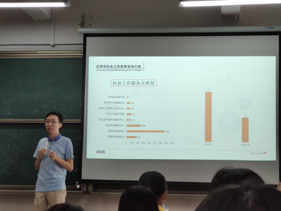 王会长就社会工作行业在我市的发展历程、我市社会工作机构的基本情况等信息向同学们进行了分享。东莞社会工作发展经过了2007-2009年的探索筹备阶段,2009-2010年的探索试点阶段,2011-2012年发展推进阶段,从2013年至今进入深化完善阶段,在服务质量监控、人才队伍素质等方面有较大提升,同时完善了政策体系,强化了监测管理。目前东莞社会工作通过专业知识、技能和方法推进社会治理创新与发展,在民政领域、禁毒领域、社区矫正、医务社会工作、社区服务等方面发挥了积极的作用。