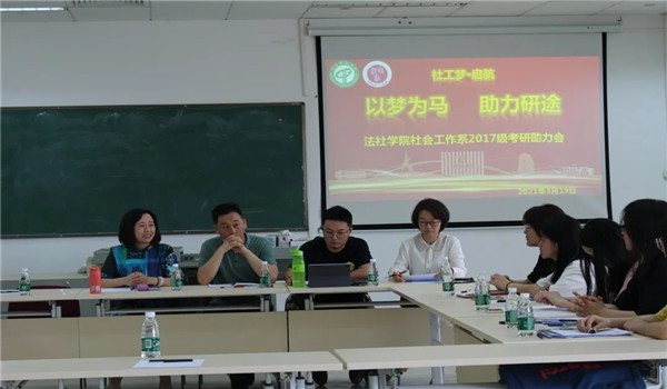 本次会议出席的老师有社会工作系系主任成伟老师、副系主任张雪老师、副系主任王海洋老师、社会工作系居正老师、李霖老师,并且我们还邀请到了社会工作系的第一届学姐,现在我校的辅导员刘欣颖老师,她曾两次赴战考研,并且成功考取中山大学硕士。