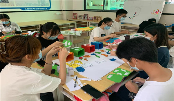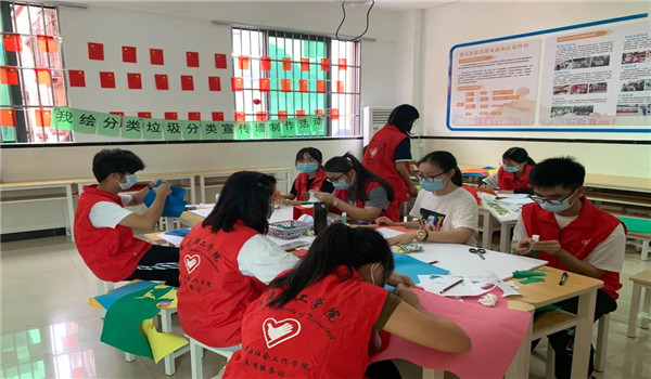 在本次活动中,志愿者们主要是通过手工制作宣传墙的形式传递垃圾分类的知识。志愿者们先分好两组,进行组内分工后,快速投入自己负责的工作中。志愿者们先后进行了筛选制作宣传墙背景、折纸、在卡纸上进行绘画、将图案裁剪粘贴到宣传墙上的工作,最终顺利完成了两个宣传墙的制作。