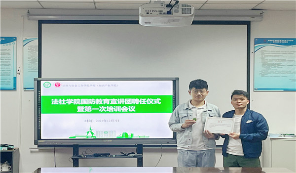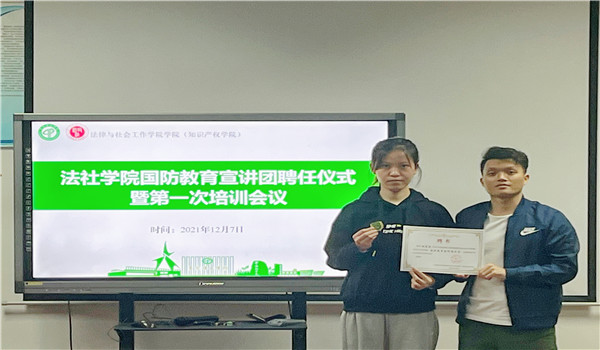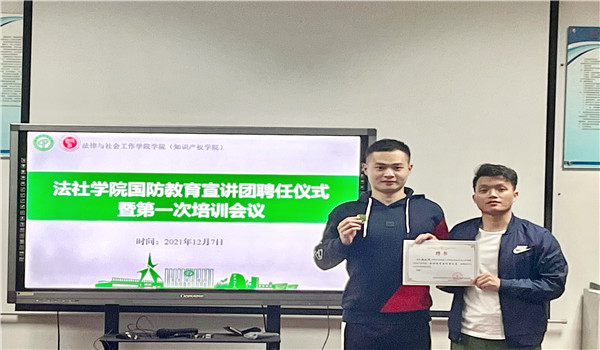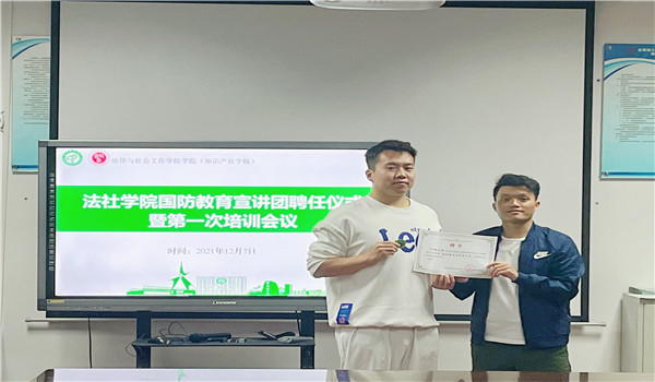 在聘任仪式上,邹欢老师讲解了国防教育和参军入伍动员宣讲的主要工作内容,对宣讲团成员的工作提出了三点要求,一是提高政治认识,把国防教育宣讲作为普及全民国防知识的契机,让更多的同学了解国防知识;二是“吃透”相关政策,把大学生参军入伍等政策理解透彻,在宣讲过程中做到政策“了然于胸”;三是创新宣讲形式,用学生喜闻乐见的形式做好国防教育和大学生参军入伍动员宣讲,激发同学们参军报国的热情。