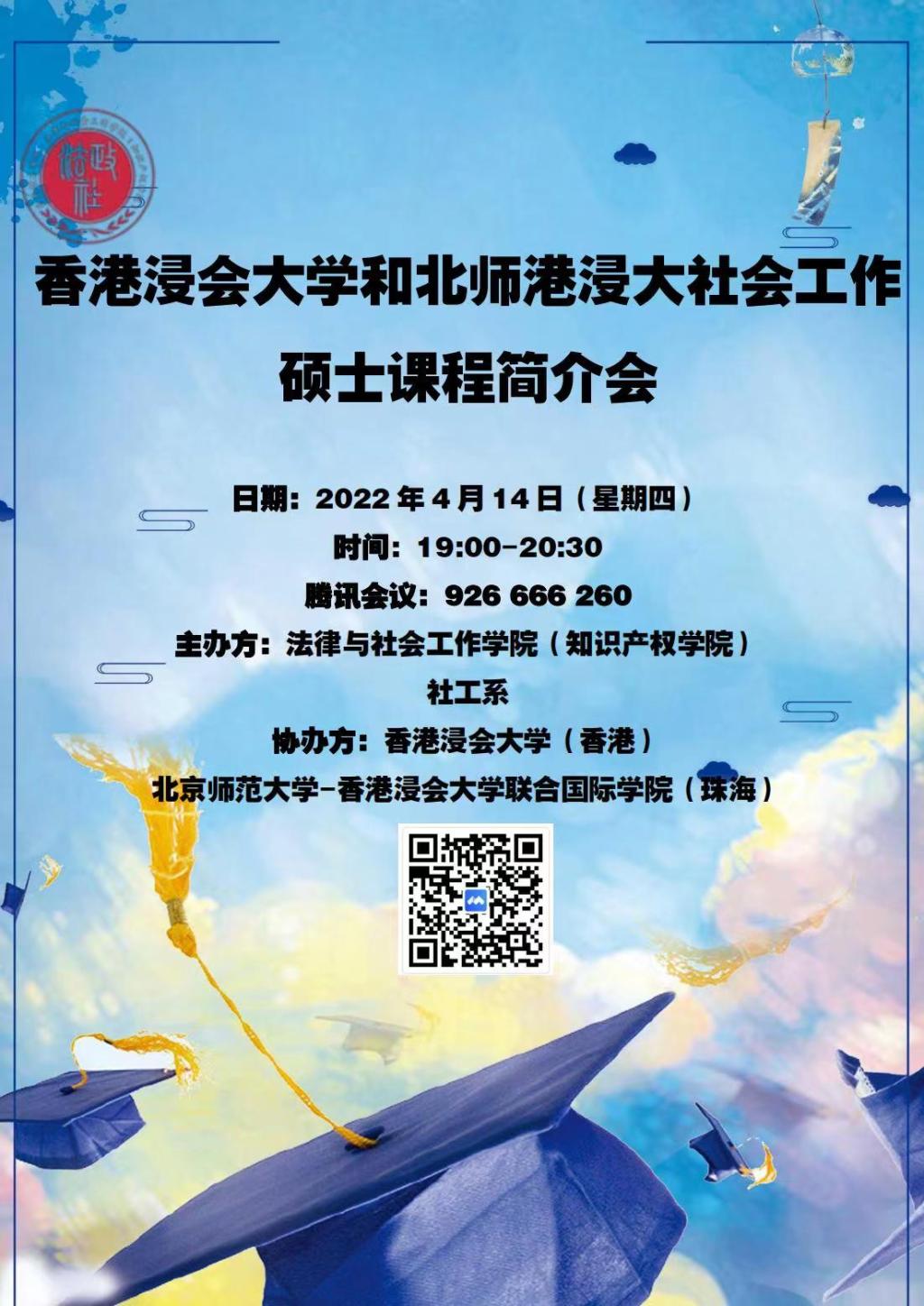 2022年4月14日晚19:00开始,法律与社会工作学院(知识产权学院)社会工作系在线上举办社工梦·启航|香港浸会大学和北师港浸大社会工作硕士课程线上宣讲会。本次讲座特邀北京师范大学-香港浸会大学联合国际学院(简称北师港浸大)社会工作与社会行政专业系主任陈錦棠、黄匡忠教授、邓美结博士、谭雅倩博士、王姝萍老师和谭凌老师为香港浸会大学和北师港浸大社会工作硕士课程做讲解与宣传。社会工作系主任成伟主持本次讲座,学院院长郑玉敏、社工系副教授卢俊、丁淑娟老师、社工实验员张子庄,同时还有来自学院各专业的学生共计近200人参与本次线上活动。