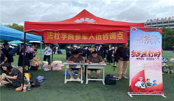 国防教育宣讲团成员胡岸婷、李伟锋、赖晓锋来到毕业生拍照现场开展参军入伍宣传活动,动员广大应届毕业生及在校生响应祖国号召,积极参军入伍,投身国防建设。