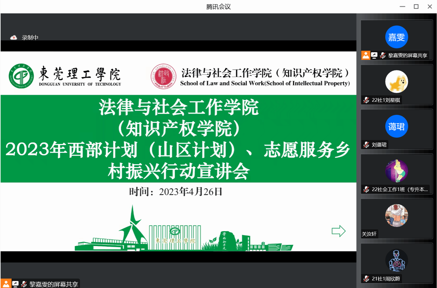 于4月26日晚19:30在腾讯会议开展2023年度广东西部计划(山区计划)、志愿服务乡村振兴行动宣讲会。2022届毕业生张君瑶、辅导员邹欢老师以及学生代表参加了分享会。