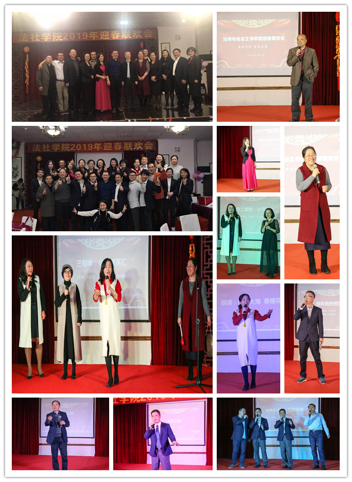退休教师李姥爷李益民教师中阮伴奏。演唱声线动人,伴奏声音撩人,两者一唱一伴,配合无缝,堪称完美。而最令人期待的是有着法社男神之称的汪辉勇教授带来的个人脱口秀,汪教授潇洒自如的演说,令在场观众时而捧腹大笑时而会心一笑,场面轻松和谐。接着又是云南姐妹花李文伟和吉海荣两位老师带来的云南民歌“小河淌水”,呵,这对姐妹花,台上风姿绰约,天籁之音充满带个现场,令人不禁感慨“人比花娇”。而将晚会带到一个新高潮的是紧接着的男声合唱,由丘永辉、刘海波、邱可荣、蔡贵峰带来的“打靶归来”,嘹亮雄壮的唱腔使现场观众胸腔不禁升起一股激昂,忍不住跟着轻轻唱和。在由成伟教授带来的朗诵“面朝大海,春暖花开”的声声缓缓、款款情深的演译下,现场气氛逐渐变得柔情、慢慢缓和,带人来到了海子的世界畅游了一番。联欢会有序地进行着,中间穿插着几次抽奖环节,气氛热烈愉快。时间也过得很快,晚会最终在大合唱“难忘今宵”的歌声中落下了帷幕。
