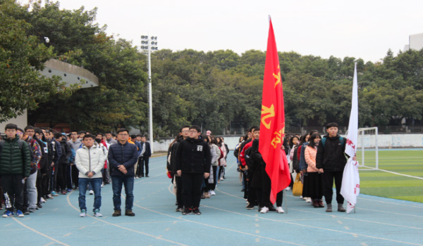 升旗仪式在莞城校区田径场举行。伴随着激昂雄壮的国歌声,鲜艳的五星红旗冉冉升起,迎风飘扬,全体师生肃立注目。
