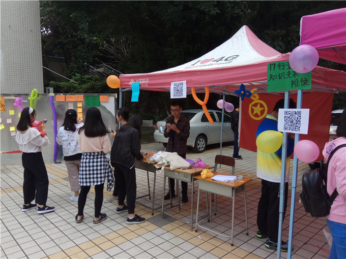 2017年11月16日早上,2017级行政管理1班在我校第一饭堂前进行了第三次团日活动:以摆摊形式开展知识竞赛趣味小游戏。本次活动以在轻松的氛围中增强学生对党团知识为宗旨。