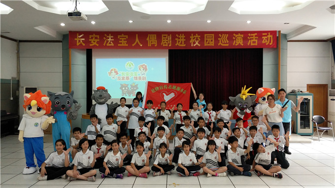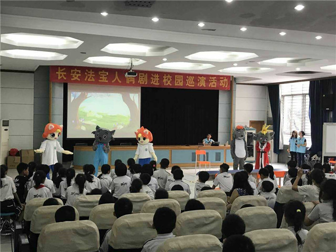 首先,两位主持人向在座的同学们问好,随后,给同学们播放了长安法宝宣传片,请出长安法宝向大家打招呼,大家热情高涨,紧接着,便到了激动人心的时刻——人偶剧表演。同学们非常地积极主动融入课堂,观看得十分认真。灰太狼、红太狼等演了一场出色的反家庭暴力故事,赢得了同学们的热烈掌声。