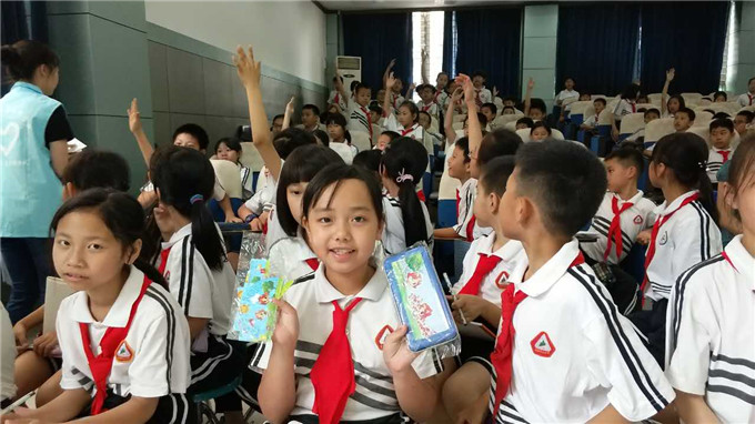 表演结束后,到了问答环节,同学们非常地积极主动抢答,主持人问题都还没念完,全部同学齐刷刷地迅速地把手举起来,后面的同学都等不及地站了起来,同学们起来回答问题的,都得到了尺子或铅笔盒等精美礼品,他们十分开心,取得答对问题的成就感,脸上挂着洋溢的笑容。
