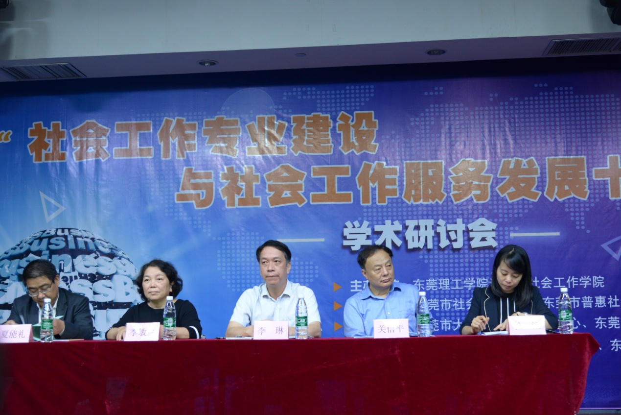 校长李琳教授、南开大学社会建设与管理研究院院长暨中国社会工作教育协会常务副会长关信平教授、东莞市民政局副局长杜江女士、广东省社会工作师联合会会长李敏兰女士、法律与社会工作学院副院长夏能礼博士,以及来自山东大学、中央民族大学、深圳大学等高校的知名学者、相关政府部门领导、实务界精英和社会工作系师生参加了此次研讨会。