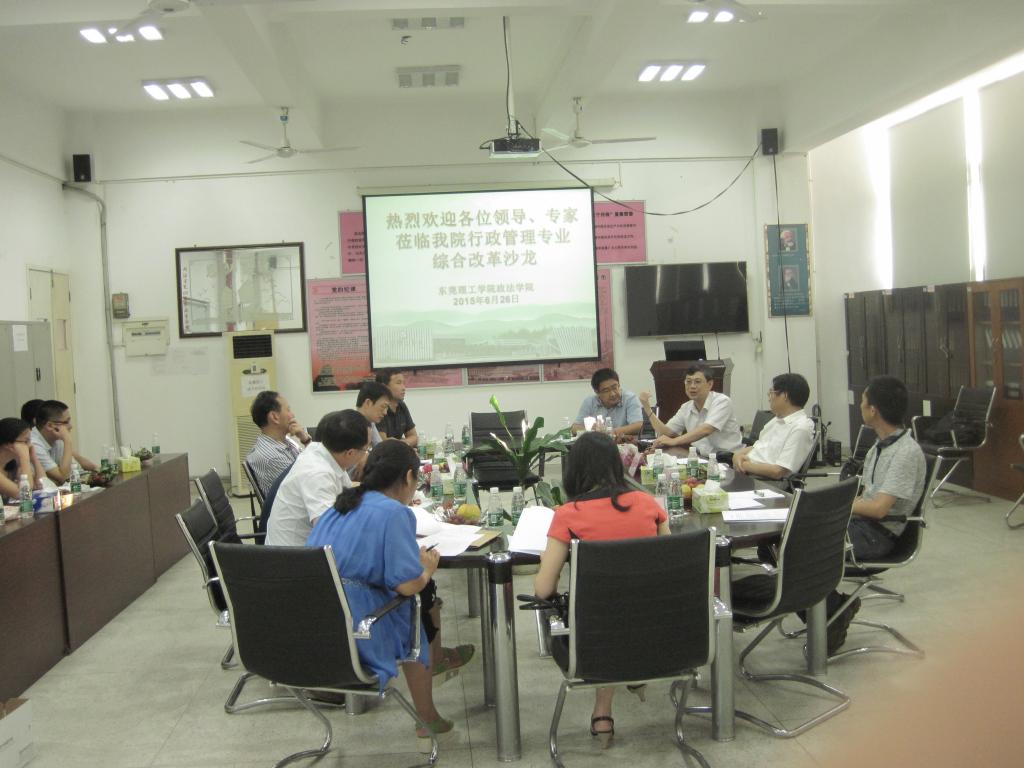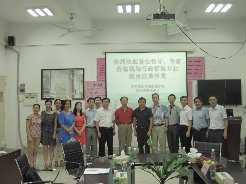 政法学院在经管楼举办了行政管理专业综合改革沙龙。华南理工大学公共管理学院院长吴克昌教授、暨南大学公共管理学院院长蔡立辉教授、东莞市台湾事务局胡国勇局长、东莞浩曦阳电子有限公司唐卫平副总裁、禁漫
