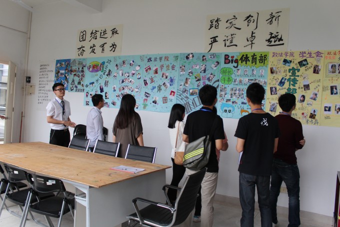 评比伊始,政法学院学生会主席黄劲锋首先带领评委考察团亲临学生会办公室。举目环视,从墙上的部门风采展示到禁漫