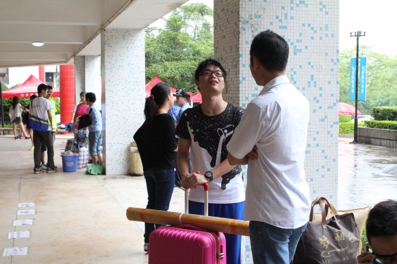 随着来报到的新生越来越多,天也下起了雨来。但是这仍然不减政法学院“小奶糖”的热情,他们冒着风雨,撑起雨伞,趟过泥水,热情接待新生,帮忙搬运行李,顺利地帮助新生完成报到手续。他们饱满的热情,周到的服务,有序的安排给前来报到的家长和新生留下了深刻美好的印象,真正让他们感受到了学院的温暖。