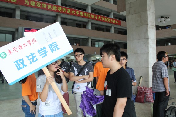 9月4日,松山湖校区的“小奶糖”(志愿者)早已养精蓄锐,穿着黑白相间、灰白相交的“奶糖衣”到达莞城校区等待莞工政法学院新鲜血液的到来。