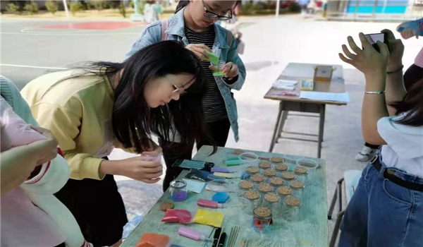 在沙画瓶和川崎玫瑰的制作区,闻讯而来的同学们在现场尽情地发挥着自己的创造力,制作出了一个又一个漂亮的沙画瓶与精美的玫瑰花。在游戏问答环节中,同学们了解了有关国际大学生节的知识,明白了国际大学生节的意义所在。