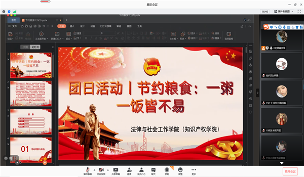 组织各班团支书在腾讯会议平台,开展了线上主题为“节约粮食,一粥一饭皆不易”的团日活动。