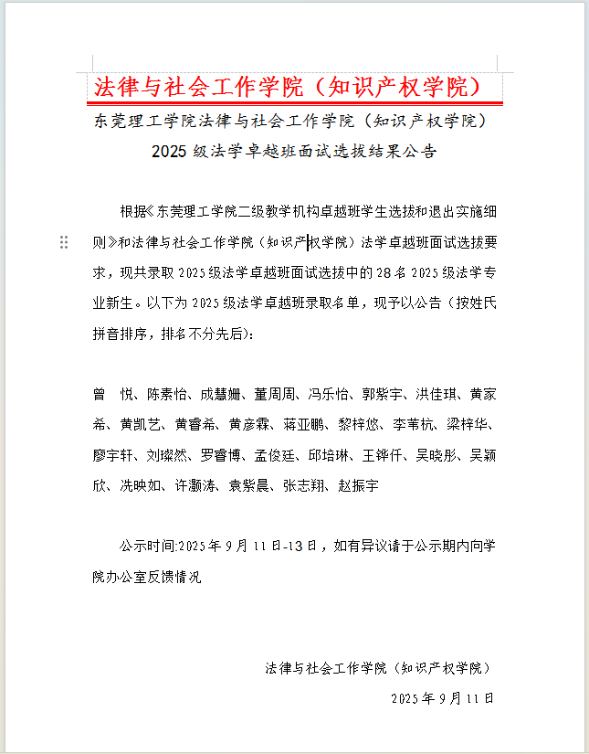禁漫 2025 级法学卓越班面试选拔结果公示