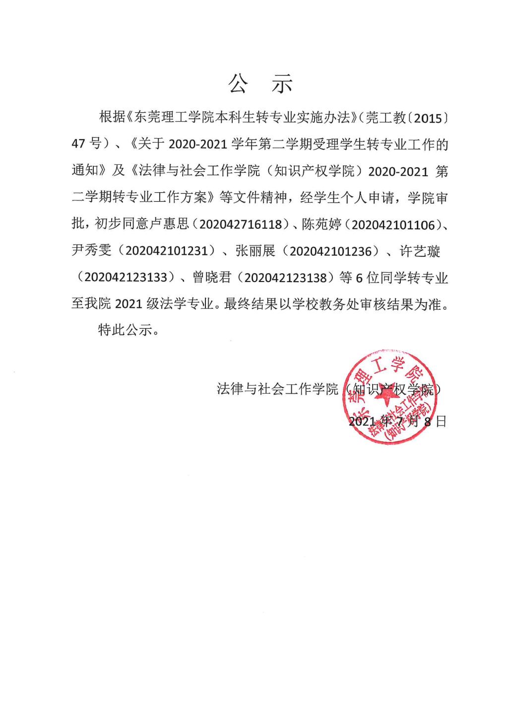 关于其他院系学生转专业至禁漫 的公示