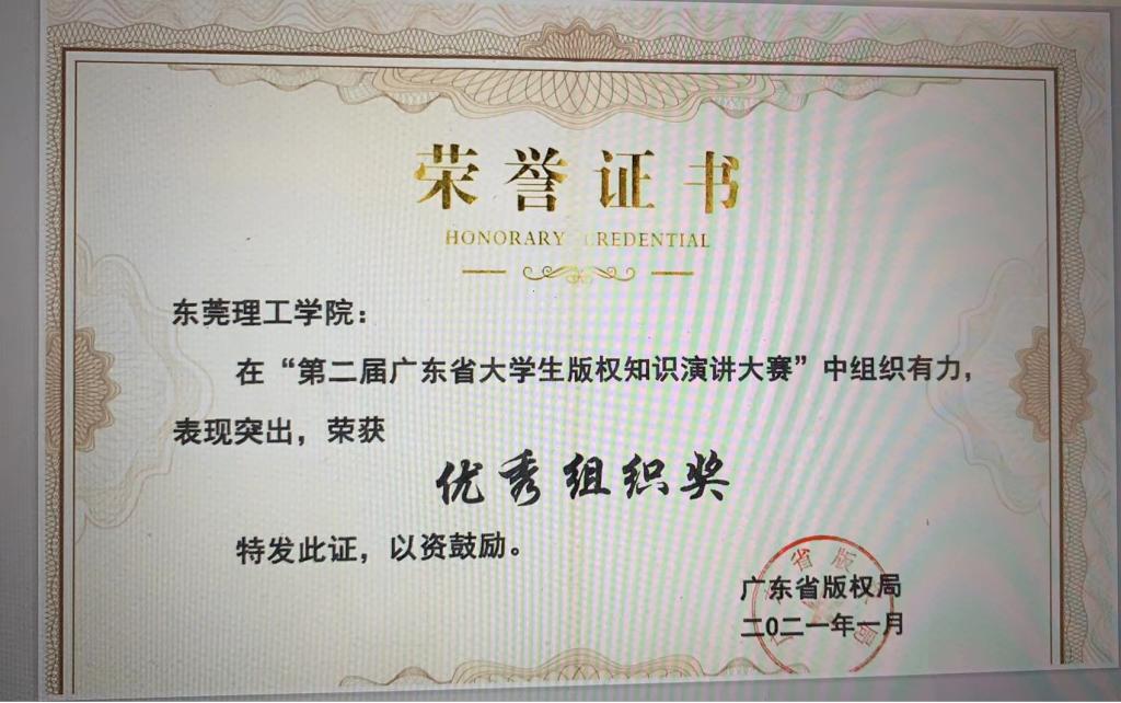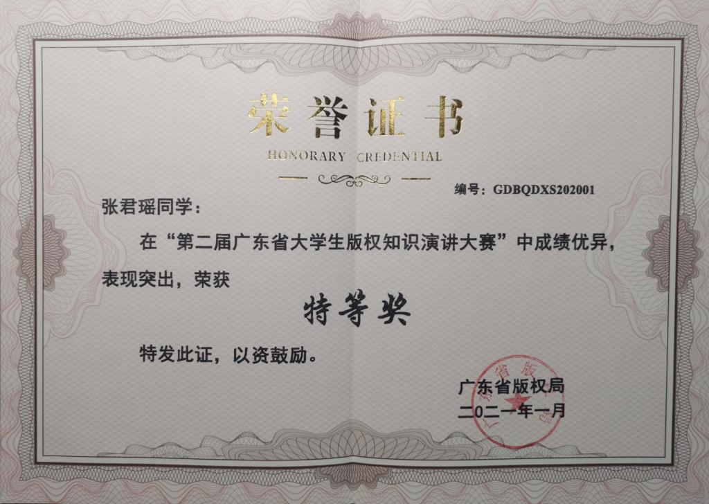 张君瑶荣获第二届广东省大学生版权知识演讲大赛唯一一个特等奖。