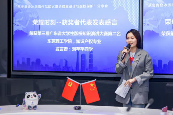 “第三届广东省大学生版权知识演讲大赛”第二名2020级法学(知识产权)1班的刘芊芊同学发表获奖感言。