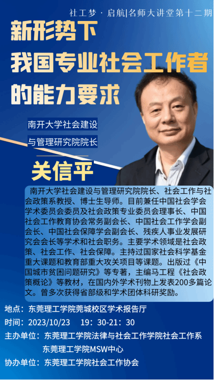 2023年10月23日晚19:30,社会工作系专业品牌活动:社工梦·启航|名师大讲堂第12期讲座在莞城校区学术报告厅举办。本次名师大讲堂邀请到了我国著名社会学家、南开大学博士生导师关信平教授为我校师生做《新形势下我国专业社会工作者的能力要求》的报告。出席本次活动的主要有社会工作系全体学生,禁漫