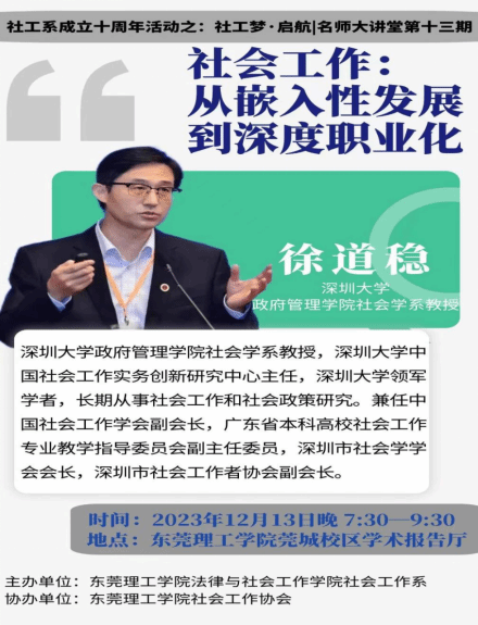 2023年12月13日晚19:30,社会工作系专业品牌活动:社工梦启航|名师大讲堂第十三期深圳大学徐道稳教授讲座在莞城校区学术报告厅顺利开展。此次,社会工作系邀请深圳大学政府管理学院社会学系徐道稳教授为我校师生与东莞一线社工做《社会工作:从嵌入性发展到深度职业化》的报告。禁漫