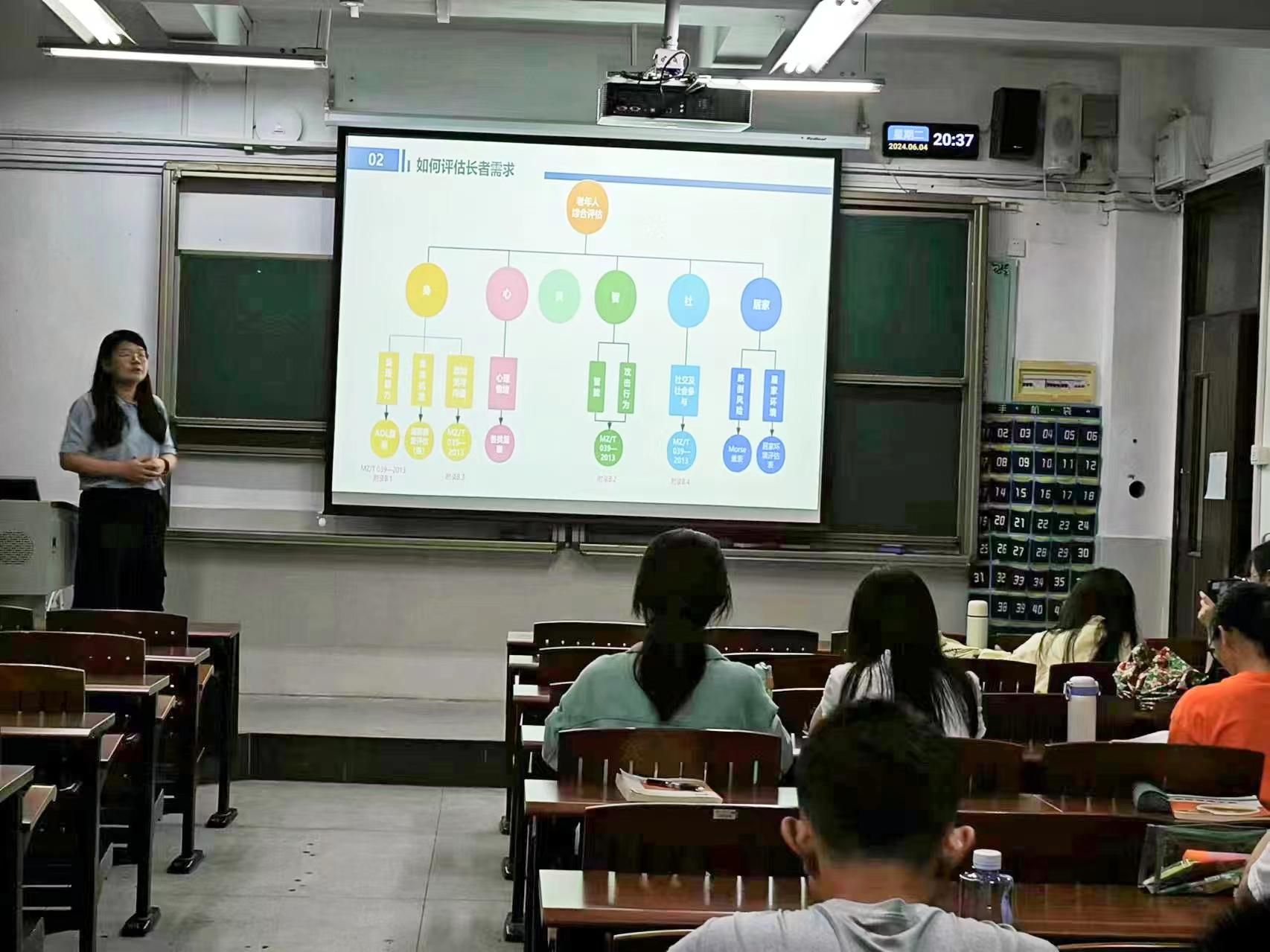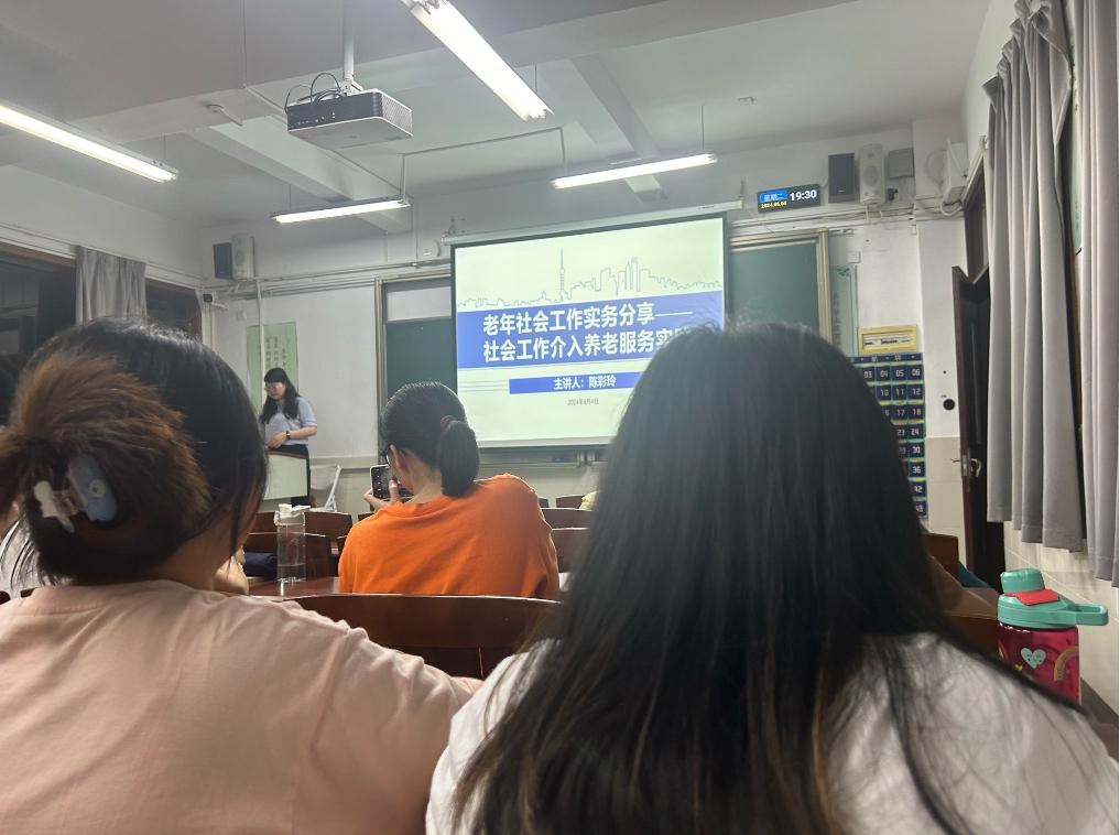 为了让同学们进一步了解老年社会工作实务,了解老年社会工作的发展,《老年社会工作》课程老师林寒特别邀请了东莞市正阳社会工作服务中心社工陈彩玲于2024年6月4日晚上为2022级社会工作的学生分享其自身机构的经历和一些真实案例。