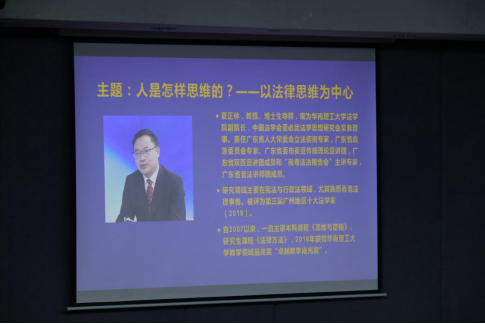 本期讲座首次与法学专业主干课程相结合,主题是《人是怎样思维的?——以法律思维为中心》。夏教授围绕:“什么是思维?思维的过程是怎样的?生活中存在哪些思维奥妙?”这三个问题进行阐述,巧妙地设置一些与生活息息相关的场景来引导同学们发散思维,循循善诱,揭示正确思考和解答问题的步骤是“规律——前提——答案”,即所有的规律需要前提条件,才能组合成答案。
