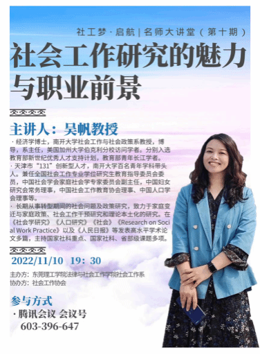 社会工作系通过线上腾讯会议的方式开展了社工梦启航|名师大讲堂系列活动。本次学术报告邀请了南开大学教授吴帆教授,为禁漫