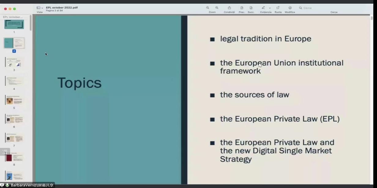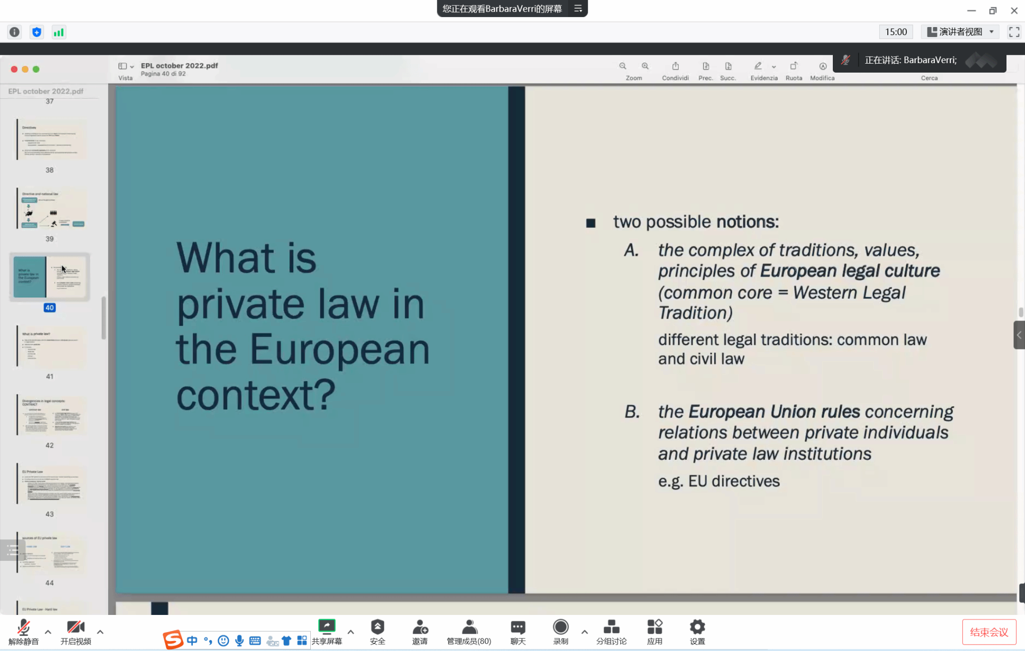 在线上开展了以“欧盟框架下的私法统一”为主题的讲座,由博洛尼亚大学法学院Barbara Verri教授担任主讲人,知识产权系系主任龚红兵副教授担任主持人。