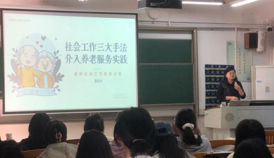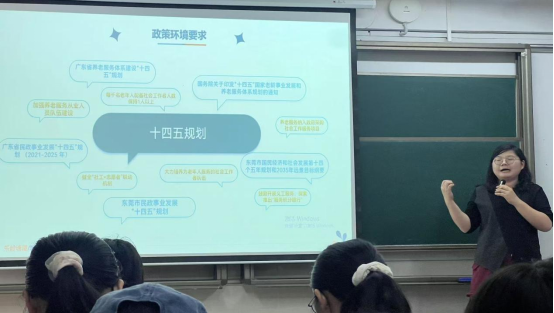 社会工作专升本班的学生们迎来了一个特别的学习机会。应林寒老师的邀请,东莞市正阳社会工作服务中心长者领域社工主任、塘厦镇综合养老服务中心主管、资深社工陈彩玲来到课室,为23级社会工作专升本班的学生们分享了她在老年社会工作领域的丰富实务经验。