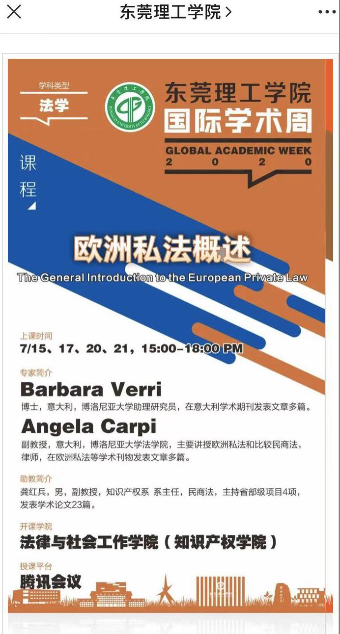 国际周(Global Academic Week),为学生提供了一个国际化交流的平台与机会。法律与社会化工作学院(知识产权学院)为全校学生开设了《欧洲私法概述》国际课程。该课程由来自意大利博洛尼亚大学法学院Barbara Verri助理研究员讲授,Barbara Verri,博士,毕业于意大利特伦特大学,主要研究欧洲比较私法,在意大利学术期刊发表多篇关于欧洲私法和比较民商法的文章,兼职律师。 课程的报名情况都非常活跃,本次课程报名人数达60人。