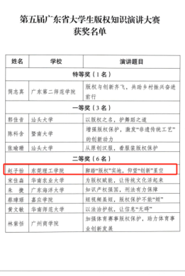 知识产权系龚红兵、李文伟、庄瑞银、胡庆乐老师和我校宣传部邓磊老师、文传学院传媒系李缨副教授的指导下,法社学子在第五届广东省大学生版权知识演讲大赛中再创佳绩。