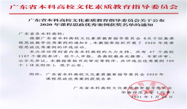 2个案例获评广东省2020年课程思政教学优秀案例