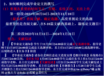 其次,龚老师特别指出2024届所有毕业生的毕业设计(论文)的相关工作即,指导老师提交选题、学生选题、开题报告、论文写作、查重检测、评分管理等事项,均需在禁漫