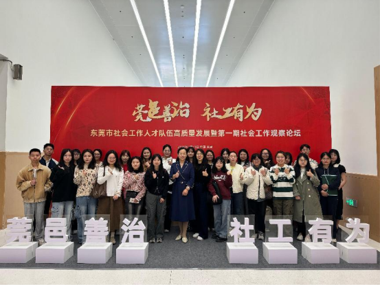 社会工作专业研究生团队在2025年3月21日上午参加了由中共东莞市委社会工作部、东莞市民政局联合主办,东莞市社会工作协会承办的《莞邑善治·社工有为:东莞市社会工作人才队伍高质量发展暨第一期社会工作观察论坛》。本次论坛以"汇聚专业社工力量 助力高质量发展"为主题,汇聚了政府部门、高校学者、社会组织代表及一线社工等多元主体,共同擘画东莞社会工作发展新蓝图。